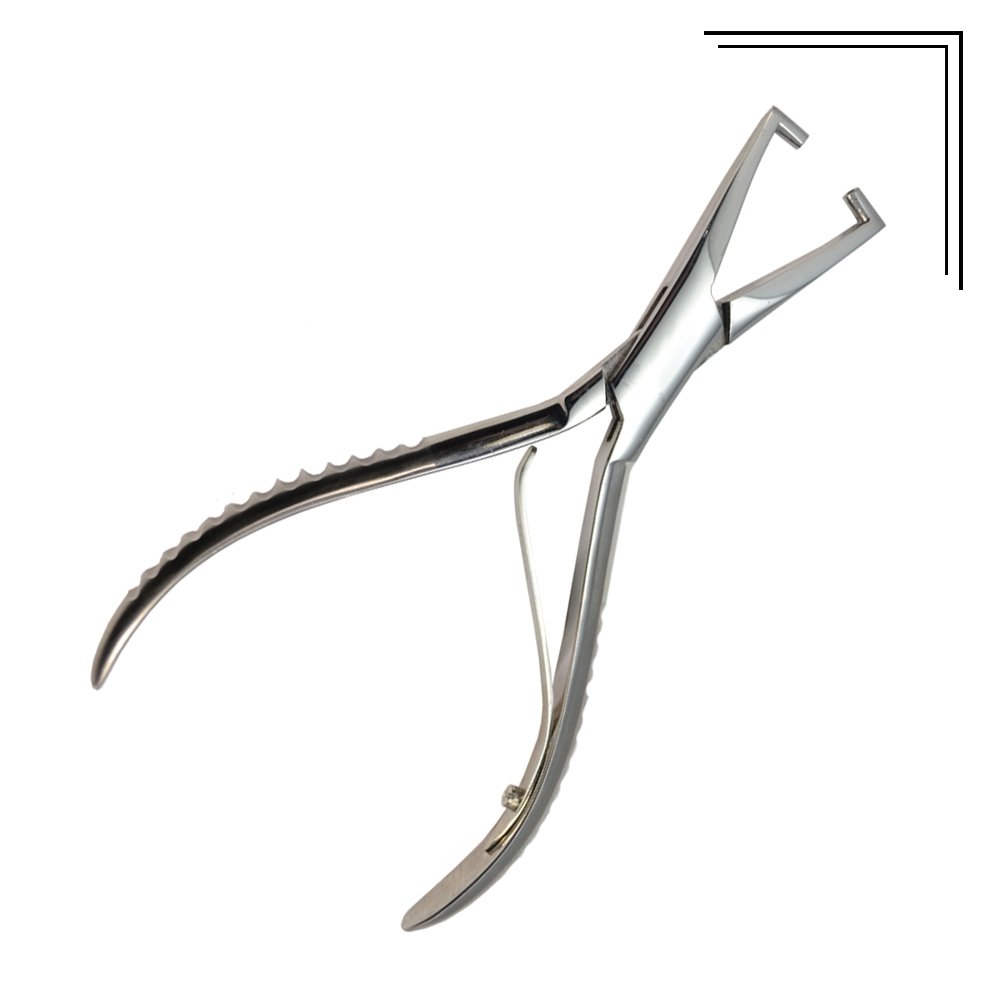 Pantoscopic angler with narrow jaw surfaces for getting into tight spots and dimples for screw clearance. Stainless steel. Conventional handles. 5 1/2″